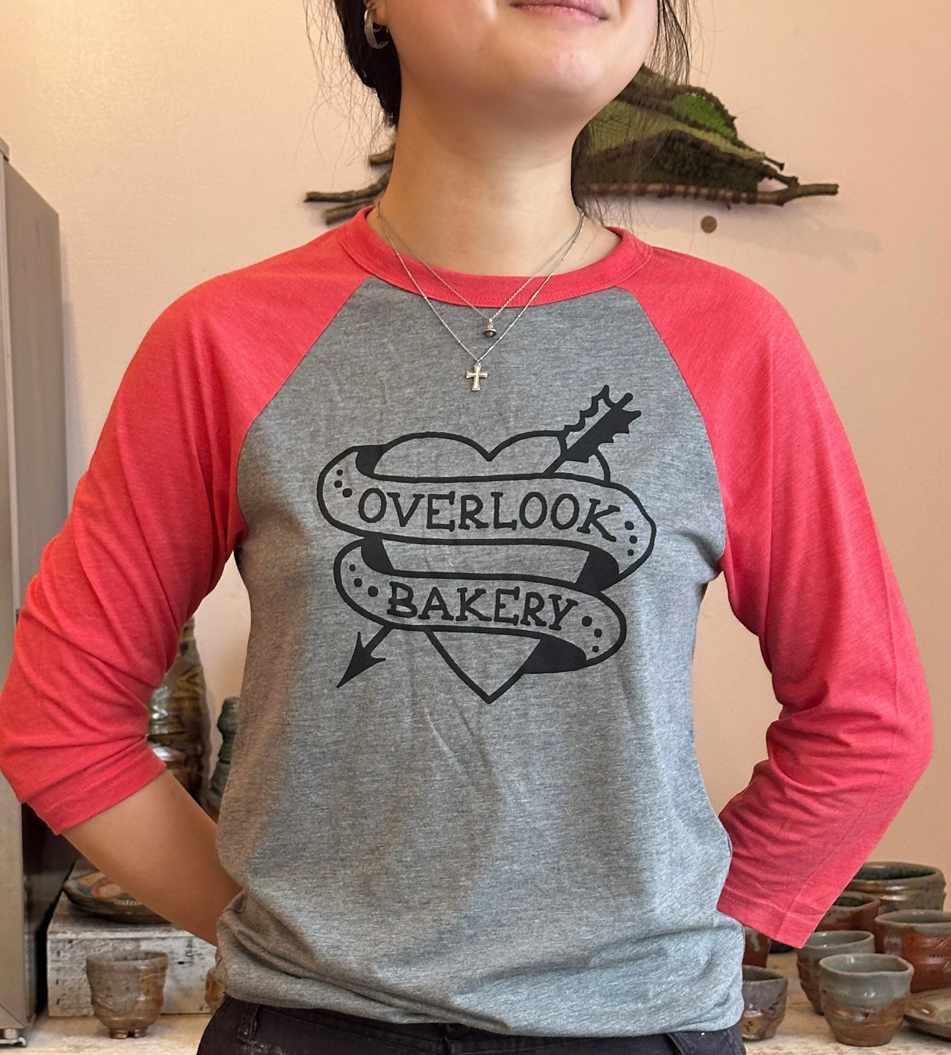 Handsome 3/4 sleeve baseball T's with your favorite bakery's logo. This very comfortable blend is 50% polyester 25% cotton 25% rayon. Red sleeves and gray body. A perfect fit for the diamond or for day to day.... Put me in, coach!